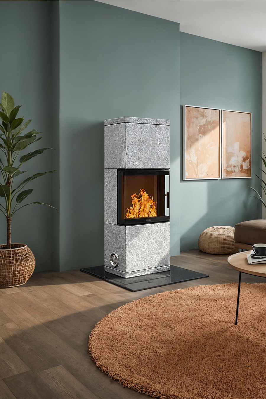 Der Specksteinöfen hat elegante Details wie die Glastür, die sich fast nahtlos in den Stein einfügt. Der sichtbare Teil ist eine die gesamte Front abdeckende Glasscheibe.