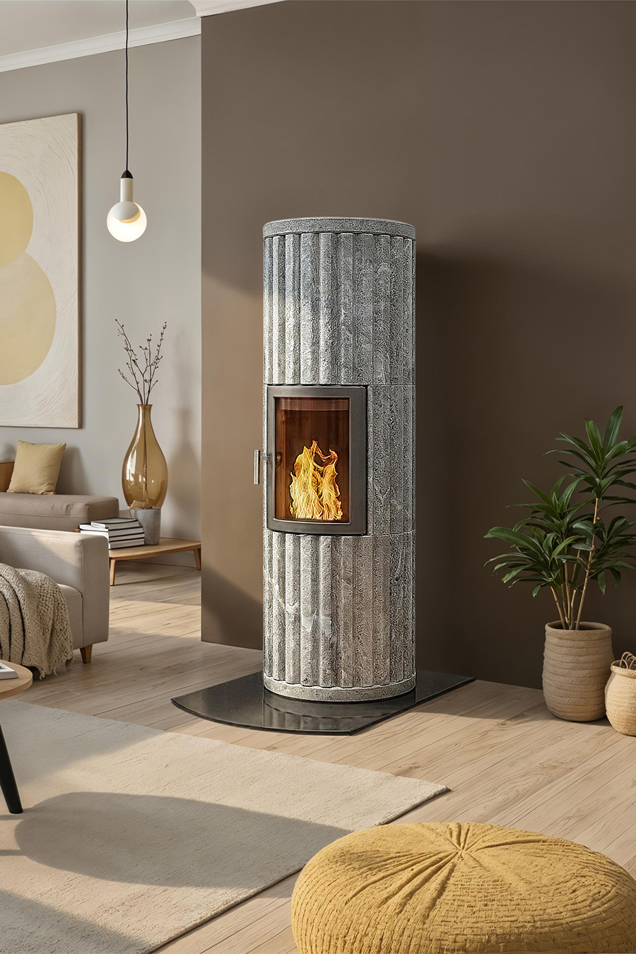 Kristin+ mit Krone. Der Speckstein-ofen eignet sich gut für größere Wohnräume und insbesondere für solche mit hohen Decken.
