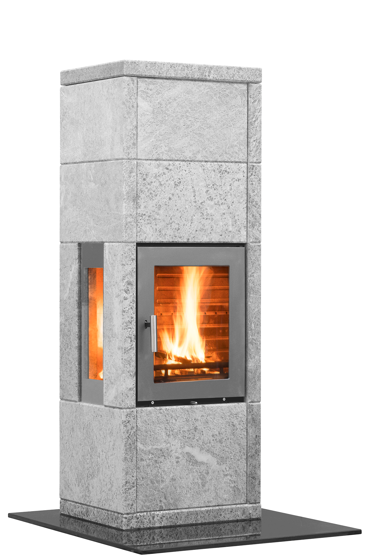 Kube ovnen har klassiske, rene linjer, med noen fine detaljer, som side-glassene som er plassert i steinen, uten stålramme. Kube ovnen kan fås med eller uten sideglass, samt i ulike høyder. Som alle våre ovner er døren utført i høy-kvalitets støpejern, noe som gjør den robust og gir den lang levetid. Alle våre Kube-modeller fås med grå dør. Side glassene er doble, for å sikre en god forbrenning og begrenset med varme-utstråling gjennom glassene. Under kan du se Kube 4.